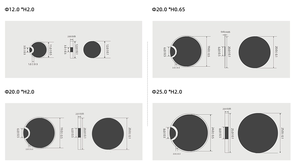 Specifications and Dimensions Φ*Hmm 12.0*2.0 20.0*0.65 20.0*2.0 25.0*2.0 Other specifications can be customized
